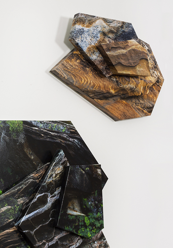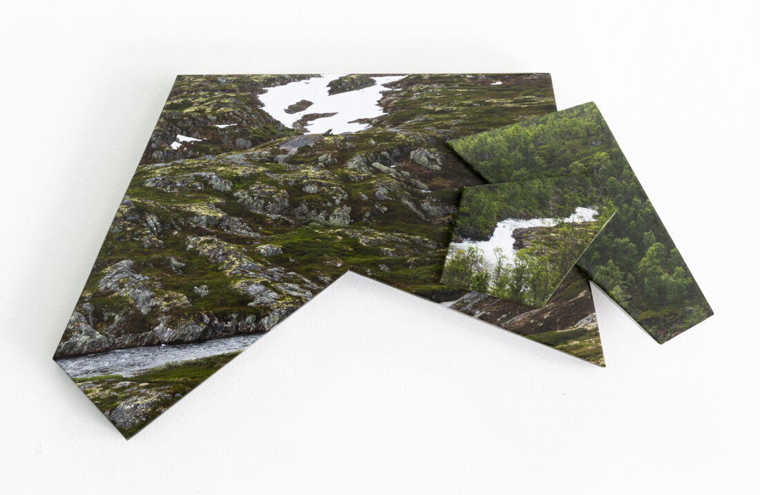 The sculptures presented in this installation foreground the viewer’s own experience of their movement through the architectural space of the gallery, forcing a deliberate physical interaction, in particular paying specific attention to the interrelation of the various facets and angles of each piece to those of its neighbours, in the aim of altering both the visual and conceptual perspectives and viewpoints of the photographic image.
